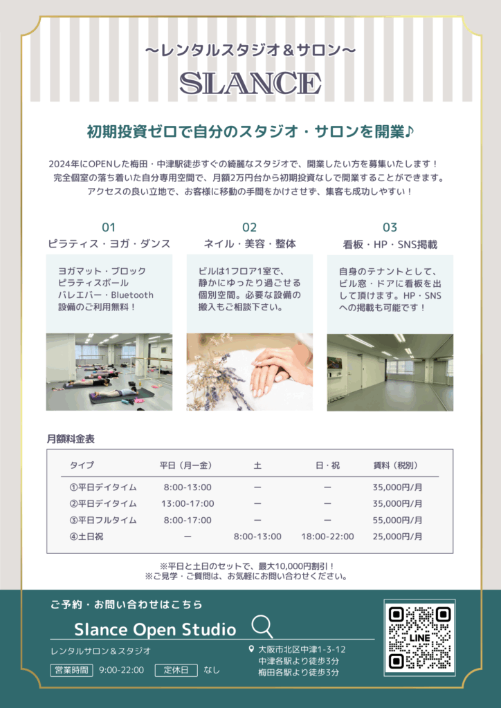 2024年にOPENした梅田・中津駅徒歩すぐの綺麗なスタジオで、開業したい方を募集致します。