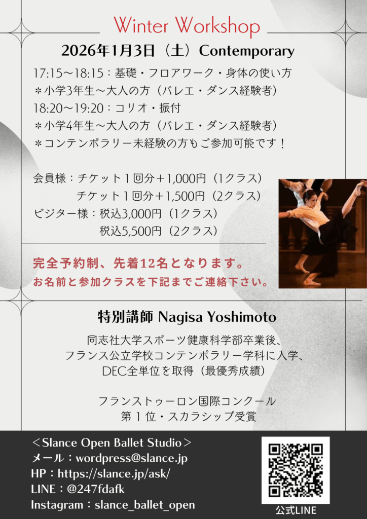 今回はクラシックだけでなく、コンテンポラリークラスも開講致します。身体の使い方、フロアワーク、振付など様々なレクチャーを受けられますので、未経験の方も是非チャレンジしてみて下さい!