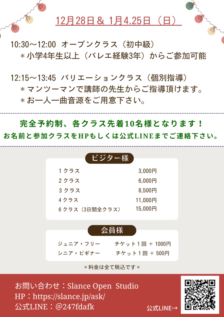 ご予約は各クラス先着順となりますので、ホームページの「お問い合わせ」もしくはスタジオ公式LINEからお早めにお申込をお願い致します。