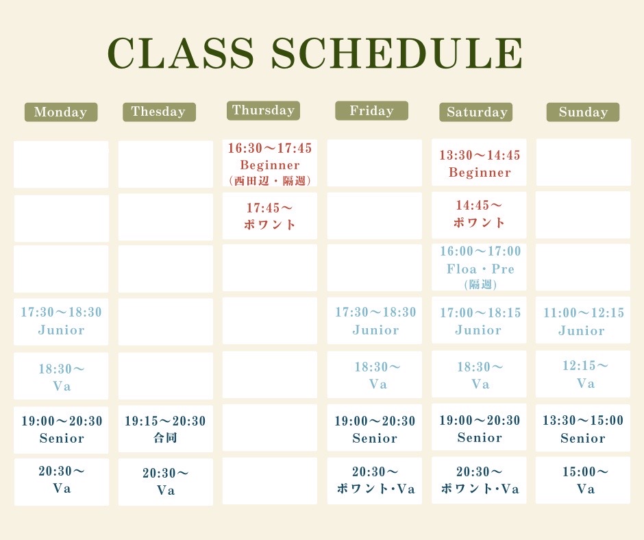 - Flor(隔週):身体・筋肉を正しく使う為のストレッチ・トレーニングを学ぶクラス