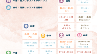 2026年度(4月以降) クラス 年齢 参考レベル:経験年数 Pre 3歳半〜小3 基礎:未経験〜 Junior 小3〜中学生 初級:1年以上 All(合同) 小5〜大人の方 中級:3年以上 Senior 中1〜大人の方 … 続きを読む クラススケジュール