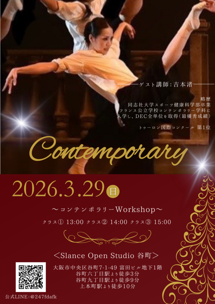 | 29日 | Contemporary WS by 吉本渚 | 13:00-14:00 基礎 14:00-14:45 振付 15:00-15:45 振付 | |