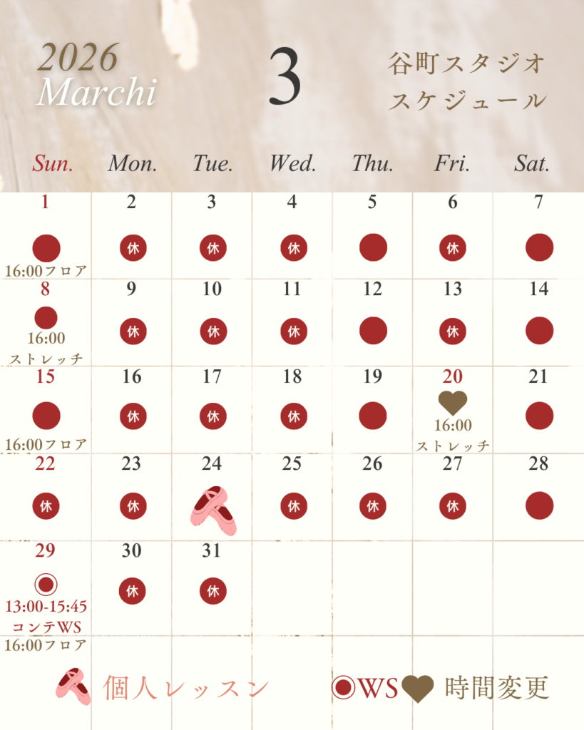 | ▽24,31日 | 全クラス ▽時間変更 | 16:00 合同 17:30 ポワント 18:00 Va | |